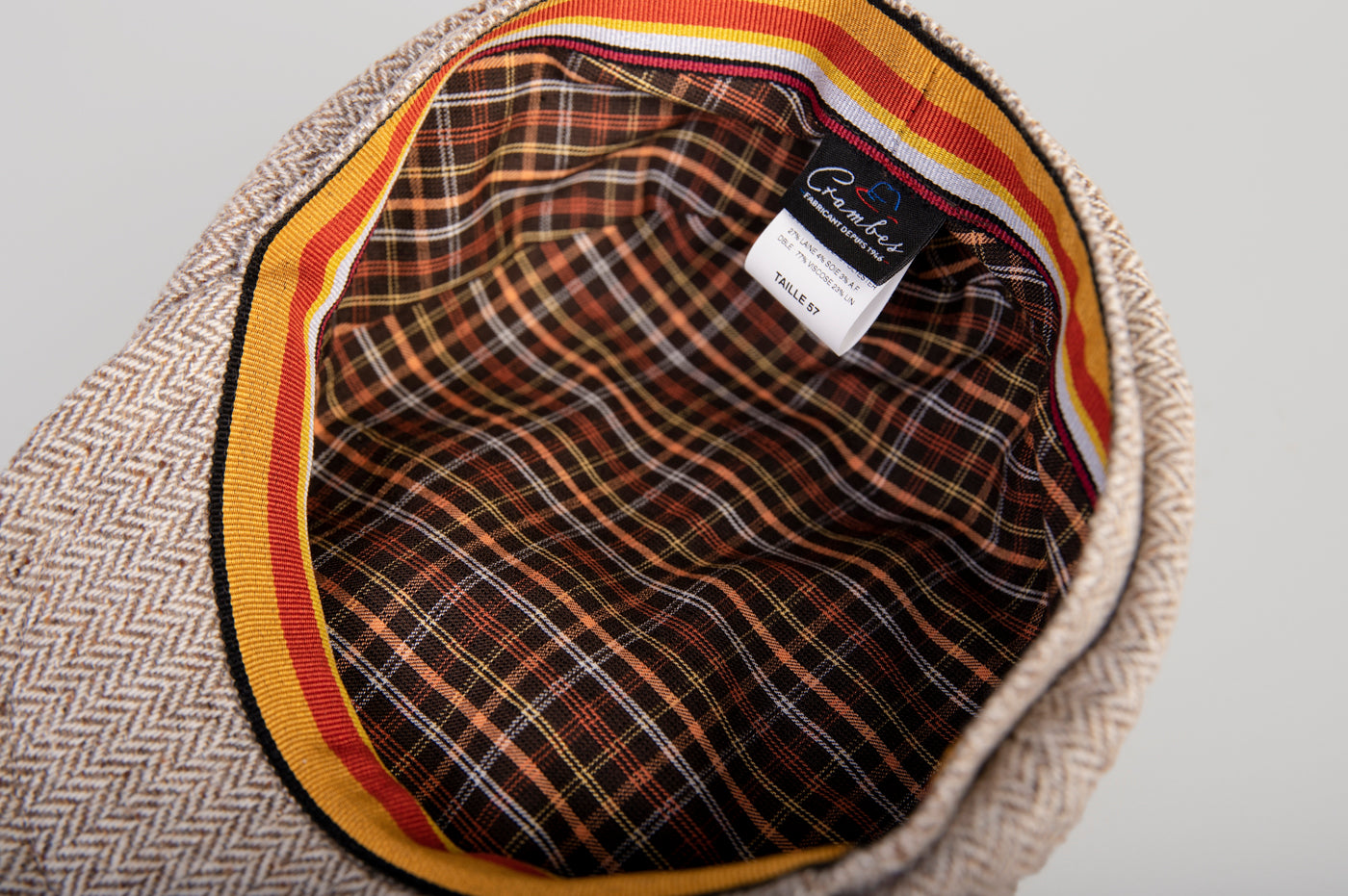 Cette casquette 8 côtes en tissu petit chevron beige incarne l’élégance discrète et intemporelle. Sa doublure à carreaux aux teintes automnales ajoute une touche chaleureuse et raffinée, tandis que le ruban intérieur rayé fantaisie apporte une note colorée et originale. Confectionnée avec des finitions soignées et un savoir-faire minutieux, elle combine style et qualité pour un accessoire aussi pratique que chic, parfait pour compléter vos tenues avec caractère et subtilité.