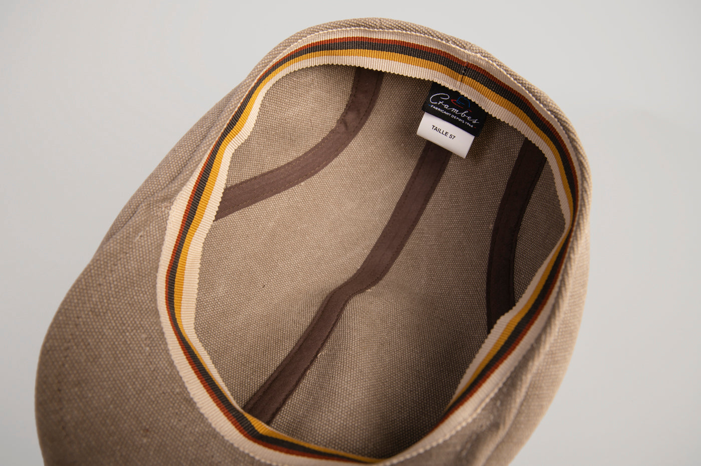 Casquette formée dans un coton lourd de 480 g/m², lavé et traité déperlant, sourcé en France, pour une main dense et une belle tenue sans rigidité. Sa matière unie, au tombé naturel, lui donne une allure sobre et authentique. Non doublée pour plus de légèreté, elle révèle à l’intérieur un ruban rayé aux tons discrets, qui vient subtilement rehausser l’ensemble. Une casquette au caractère franc, pensée pour un usage quotidien, entre protection, durabilité et détails soignés.